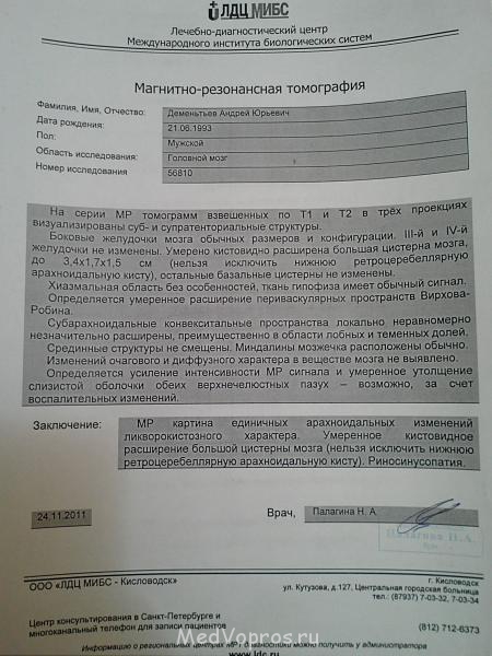 МРТноябрь 2011 г.- МР-картина единичных арахноидальных изменений ликворкистозного характера. Умеренное кистовидное расширение большой цистерны мозга до 3,4*1,7*1,5 сантиметров(нельзя исключить нижнюю ретроцеребеллярную арахноидальную кисту). риносиносопатия.