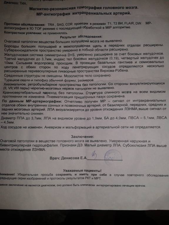 Здравствуйте. Мне 37 лет. С детства страдала мигренью. В 2012 году был приступ ТИА головного мозга. Диагноз МРТ: умеренная наружная и бивентрикулярная гидроцефалия. Признаки ДЭ. Малый диаметр ЛПА. Субокклюзия ЛПА выше места отхождения ЛЗНМА. Периодически страдаю головокружениями, звон в ушах постоянный, бывает тошнота, головные боли, блики в глазах. Есть шейный остеохондроз. Сотрясений и ушибов не было. Что означает мой диагноз, возможно ли излечение и его методы? Спасибо.